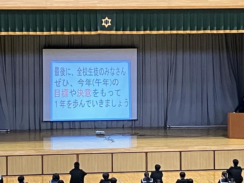 ●1月19日 全校朝会 3学期最初の全校朝会が行われました。校長講話では、今年の干支である「午(うま)」にちなんだ話をしました。講話の最後には、今年一年の目標や決意をもって1年を歩んでいってほしいというメッセージを生徒たちに伝えました。
