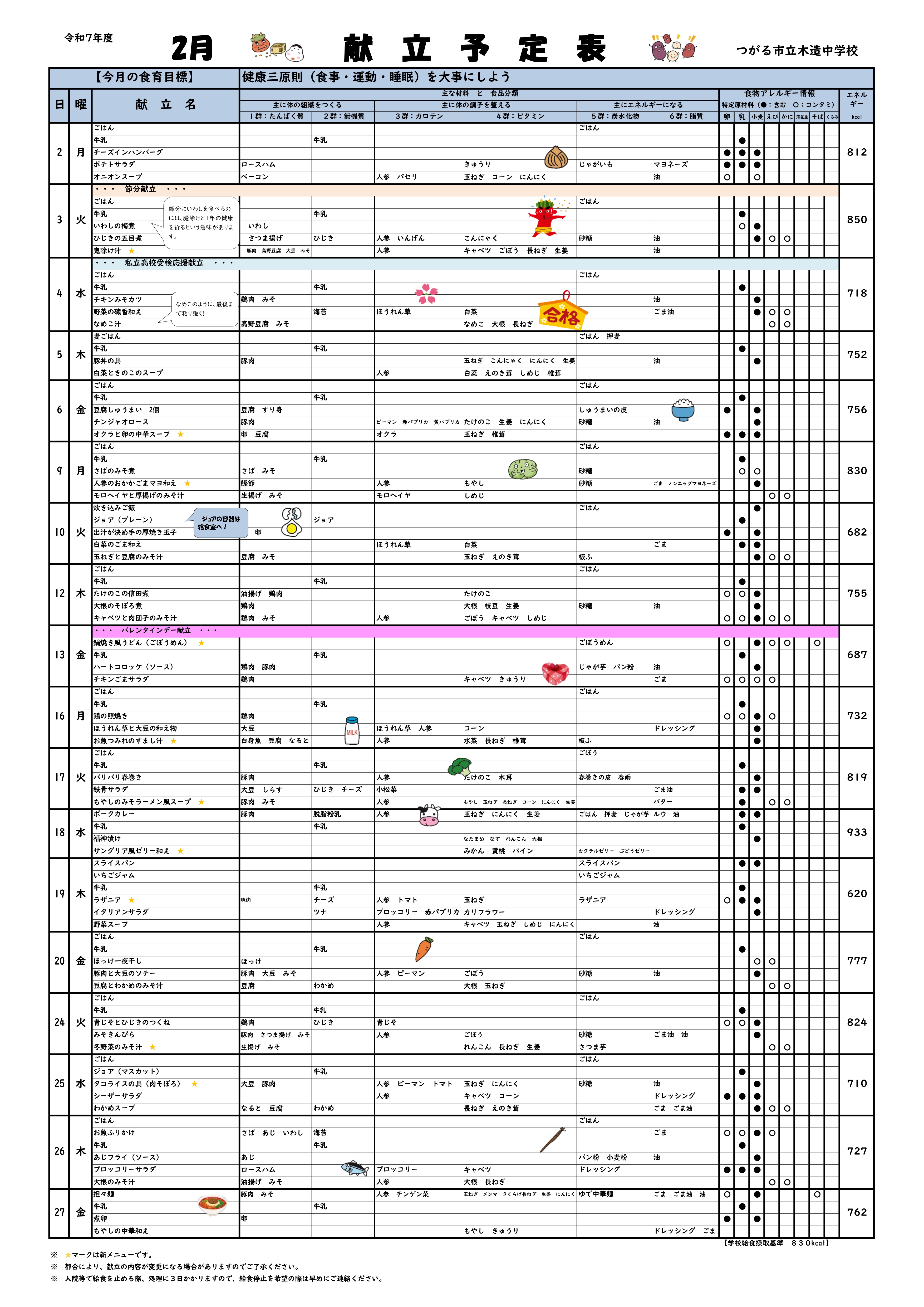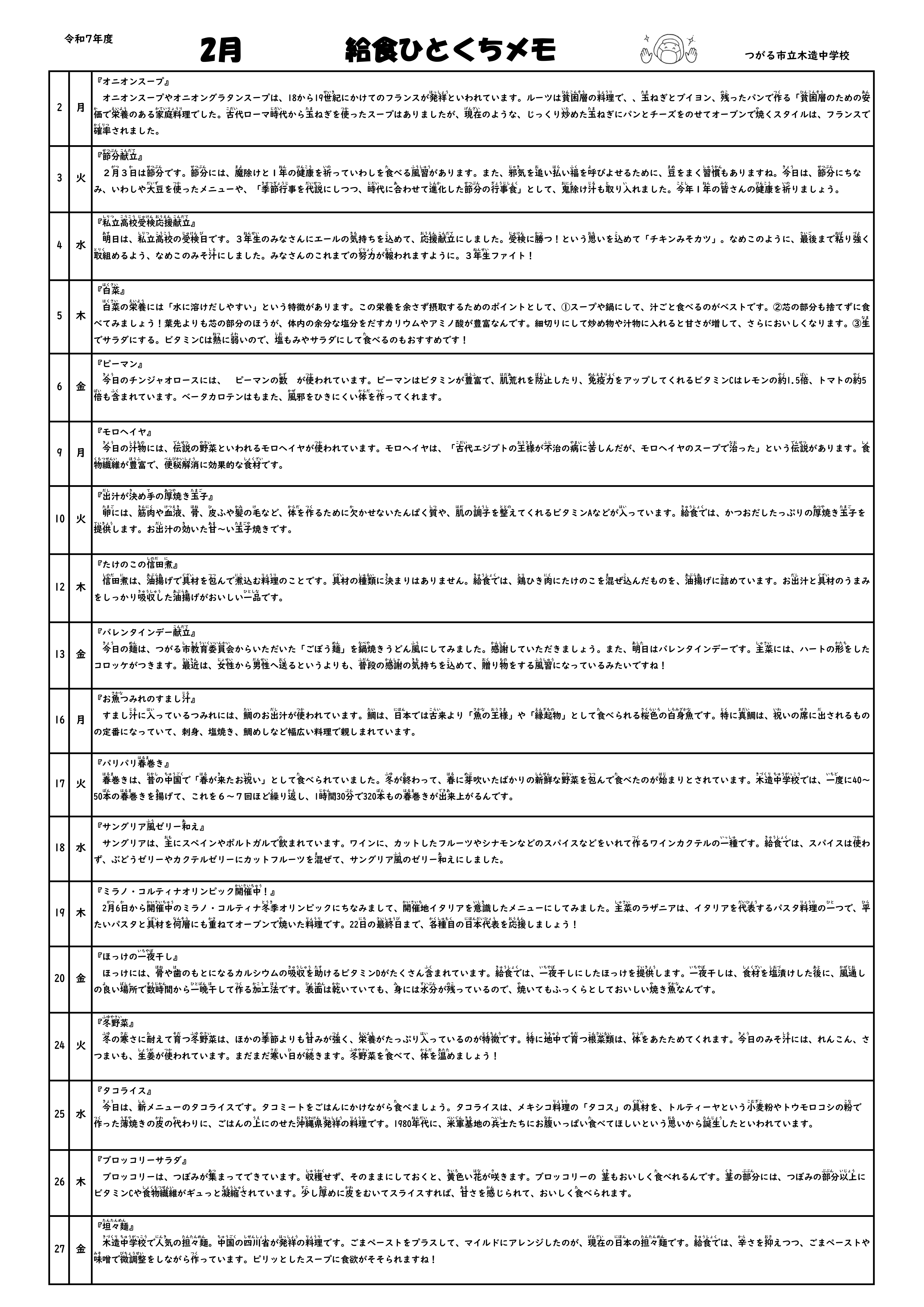 2月の献立です。今月は節分献立、私立高校受検応援献立、バレンタインデー献立があります。
